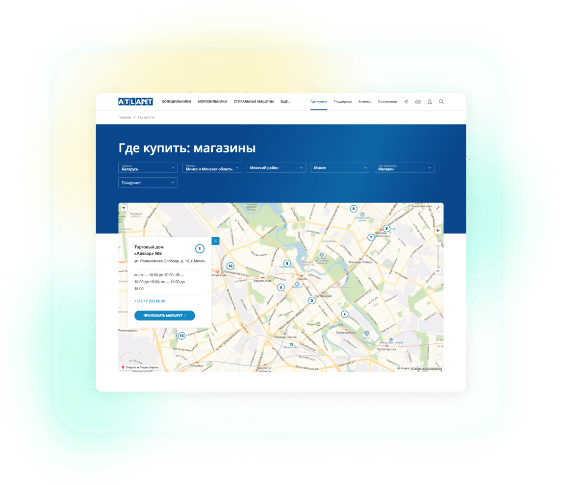 Сегодня, где бы вы ни были, вы легко можете найти удобный для вас магазин с техникой ATLANT, узнать об особенностях его работы, найти на карте или перейти на сайт.